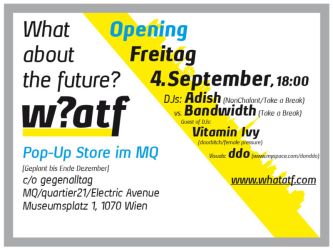 Auf Einladung der Mode Galerie „gegenalltag“ wurde ein w?atf Pop-Up Store im „gegenalltag“ Showroom, in der Electric Avenue, eingerichtet. Das Sortiment aus Mode, Accessoires, Musik, Büchern und Magazinen wurde aus Platzgründen sehr limitiert gehalten, speziell im Modebereich gab großteils nur Einzelstücke – why not?! In der wöchentlichen Veranstaltungsreihe „Zimmerlautstärke“ bespielten DJs jeden Samstag den Shop. Der DJ wurde natürlich direkt in der Auslage platziert, gut sichtbar und mit schönem Ausblick in die Electric Avenue. Das erweckte Neugier bei Vorbeigehenden und Museumsbesuchern, die dadurch angehalten wurden zu bleiben, im Sortiment zu stöbern und den coolen Beatz zu lauschen.