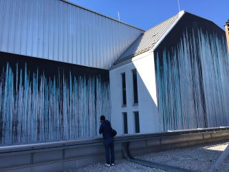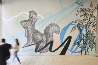 …Der Street Art Künstler Emanuel Jesse setzte in den vergangenen Jahren rund 600m2 Wandfläche (auf Lüftungstürmen, im Eingangsbereich Gigergasse, die Garageneinfahrt) mit seinen Motiven zum dem Thema Urban Jungle in Szene. In einem der Innenhöfe gestaltete Jesse außerdem eine besonders hohe Wand mit einem seiner „Schüttbilder“, werfen Sie hier einen Blick auf die spektakuläre Entstehung. Beim Rundgang sehen wir die jüngst fertiggestellte Arbeit aus dem Studio Jesse am Dach.